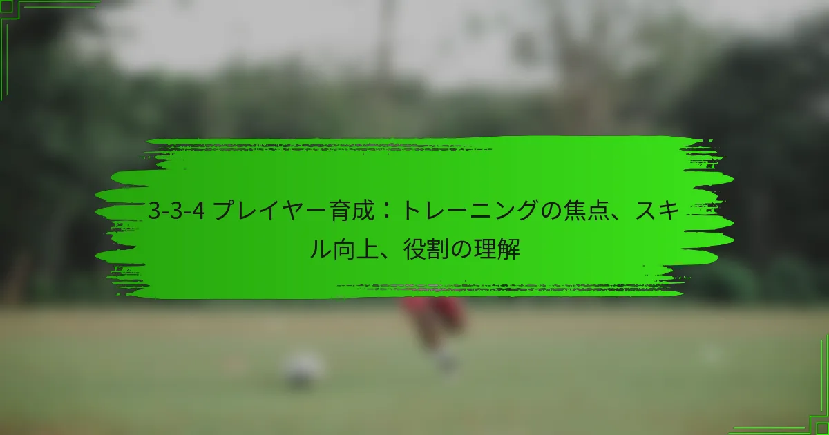 3-3-4の選手育成アプローチは、個々のスキルを向上させ、チームの結束を促進し、各選手の役割に応じた戦術的な意識を育成することを強調しています。特定のドリルに焦点を当て、定義された責任を理解することで、選手は自らのパフォーマンスとチーム全体の効果を向上させることができます。このフォーメーションは、フィールドでの成功に不可欠なコミュニケーションと適応力を促します。